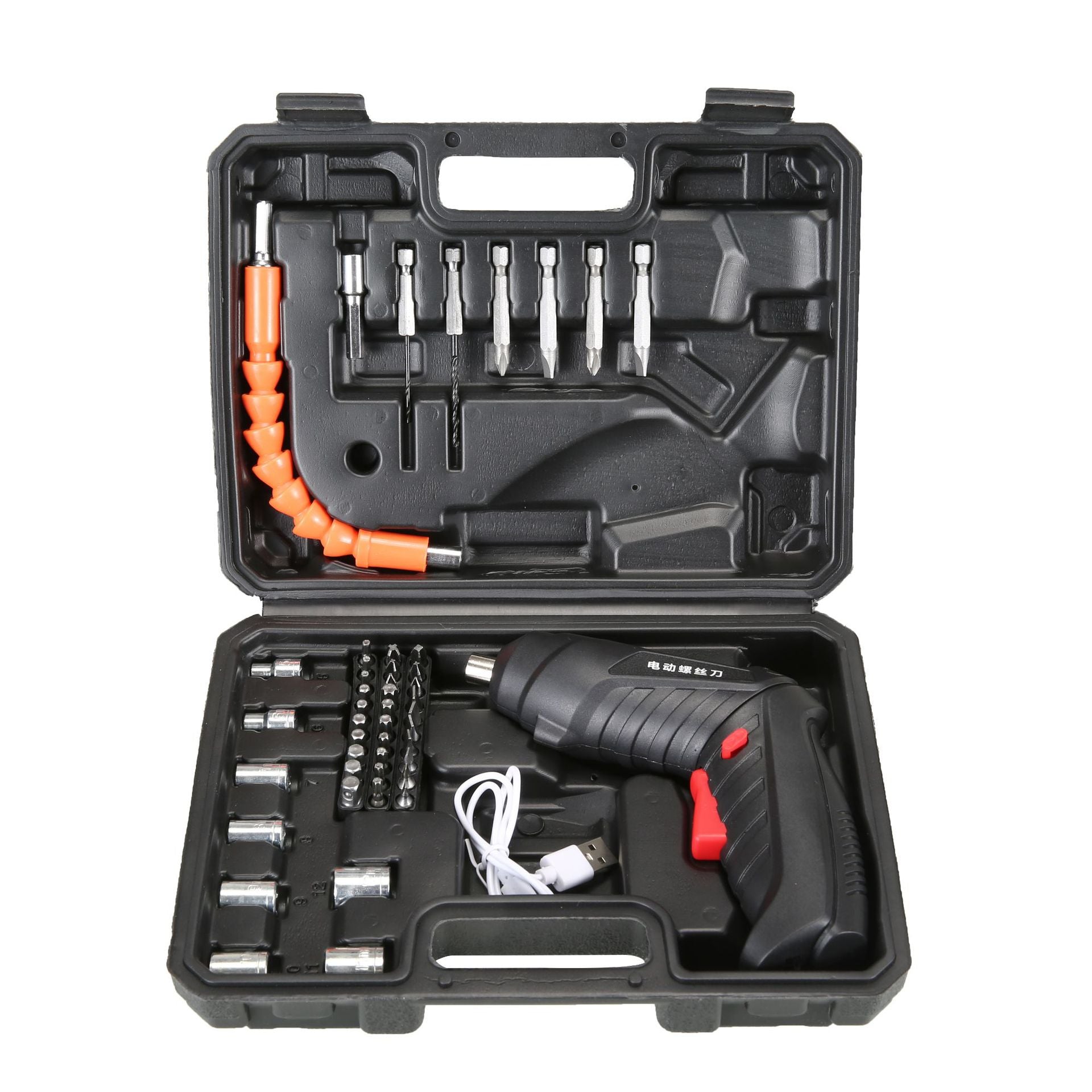 Specifications: Upgraded large toolbox, 45-piece set, black electric screwdriver